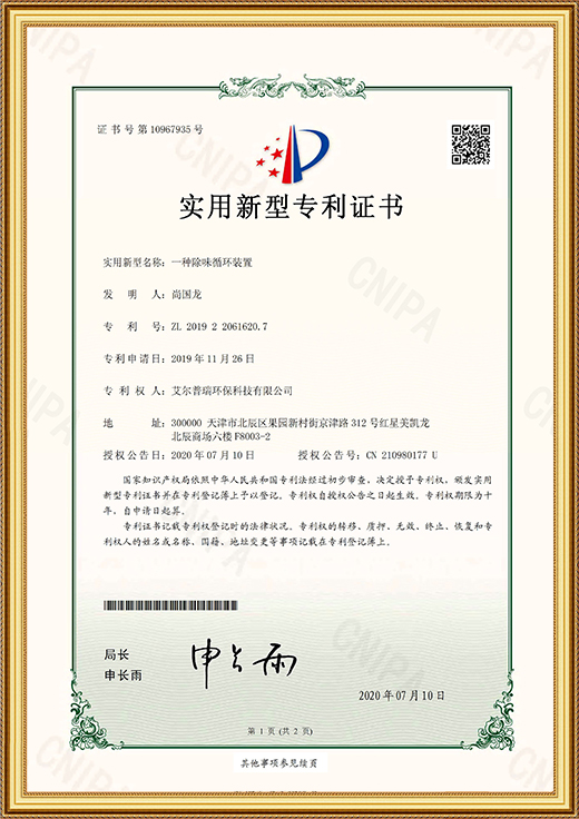 • 實用新型專利證書(一種除味循環裝置)
